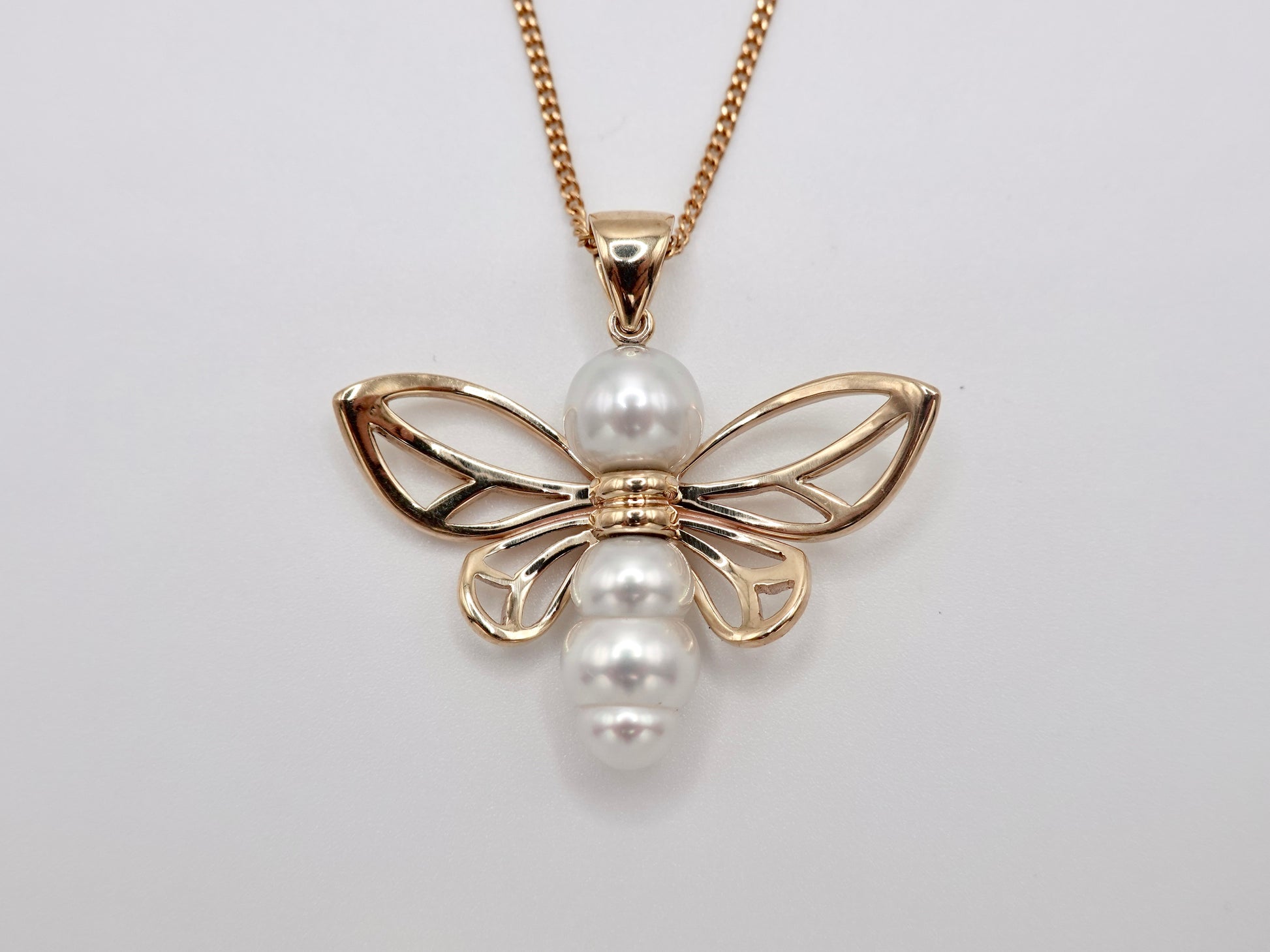 Featuring Australian Saltwater Pearls (8mm to 10mm keshi) and 9ct Yellow Gold wings and bail.